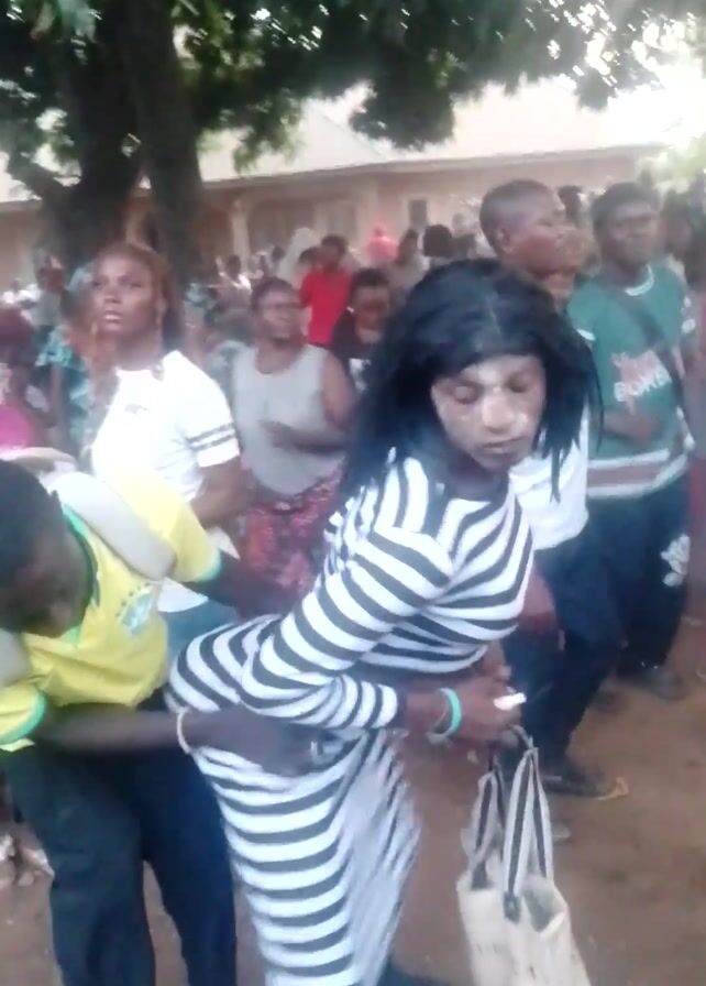 crowd of people gathered outdoors. In the foreground, a person wearing a black wig and a black and white striped dress is dancing. Other individuals are standing around, seemingly enjoying the performance. The setting appears to be a casual gathering, possibly a celebration.