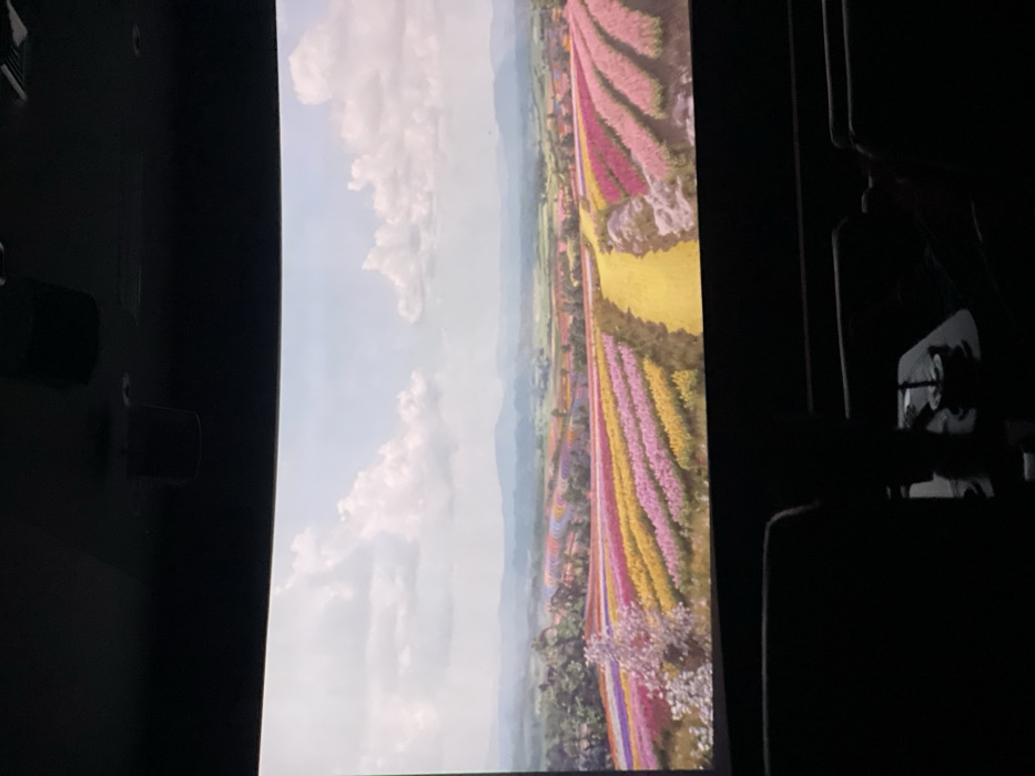 A large, rectangular screen displays a vibrant landscape with fields of colorful flowers in rows. The flowers are arranged in stripes of purple, pink, yellow, and other hues. In the background, mountains fade into a pale blue sky filled with fluffy white clouds. The left and right sides of the image are dark, revealing the edges of the theater or room where the screen is located. Speaker boxes are visible on the left, and a metal structure with controls is on the right.