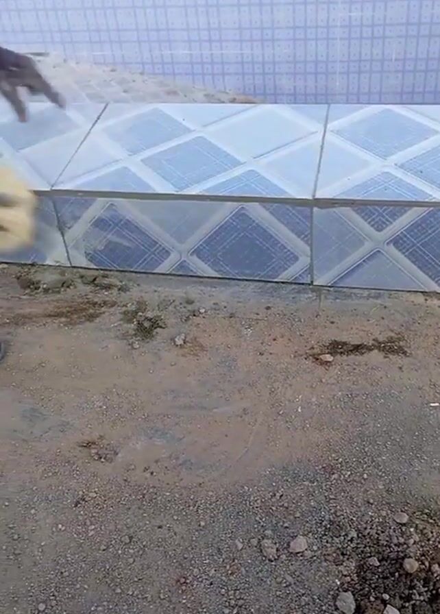 A dark-skinned man is seen from the torso down, kneeling on a dirt ground and wiping tiles on a tiled wall with a sponge. He is wearing black sandals with a white logo on one foot. The tiles on the wall are patterned in shades of blue, gray, and white. The ground is dirt with small rocks. The wall above the tile work is a light blue with a grid pattern.