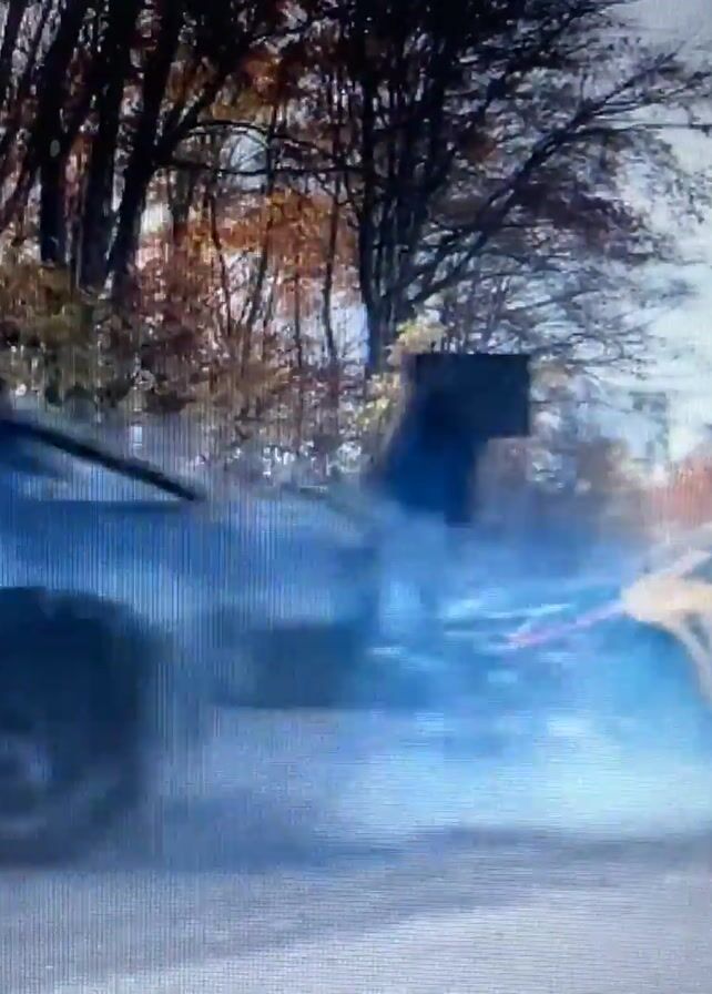 blue car drifting on an asphalt road. There are trees on either side of the road, and the air is filled with blue smoke from the car's tires. The car has a spoiler and decals on it, including a Red Bull logo. The road is cracked and worn, with some dirt and leaves along the edges. The camera angle is low, emphasizing the car's movement and the smoke.