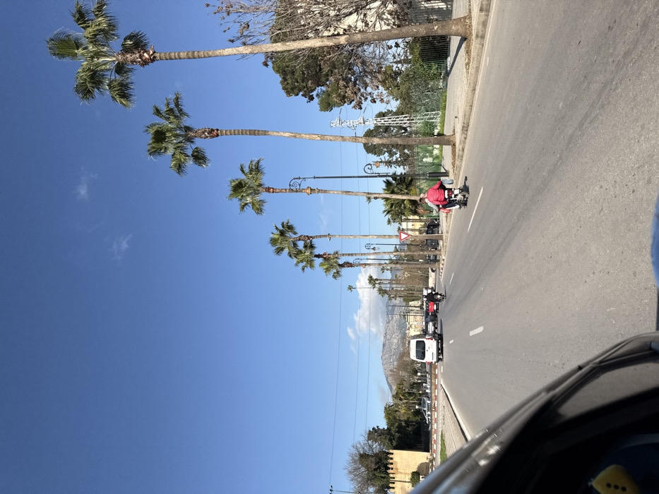 This image depicts a daytime urban street scene in Fez, Morocco, captured from the interior of a moving vehicle looking forward. The sky is clear blue with minimal clouds. A multi-lane asphalt road with white dashed and solid lane markings extends into the distance. Vehicles are observed moving away from the viewer. In the right lane, a white moped is occupied by two individuals; the passenger wears a bright red jacket. Further ahead, a white cargo van is visible centrally, followed by a person on a black motorcycle and several other distant cars. To the right of the road, a raised concrete sidewalk is bordered by a green fence and a prominent line of tall palm trees. An ornate black streetlamp with an extending arm is affixed to one of the palm trees. Beyond the palm trees, various other trees and sparse vegetation are present, along with a metal utility tower. To the left of the road, a concrete median strip contains low shrubs. A "Give Way" traffic sign (inverted red triangle with a white border) stands on the median. Further left, a light brown, fortified wall with distinct battlements, characteristic of historical city ramparts, is visible. In the far background, a range of light-colored mountains extends across the horizon, situated beneath the clear blue sky. A partial view of a dark vehicle's interior, including a yellow dice air freshener, is present in the lower left foreground, indicating the perspective.