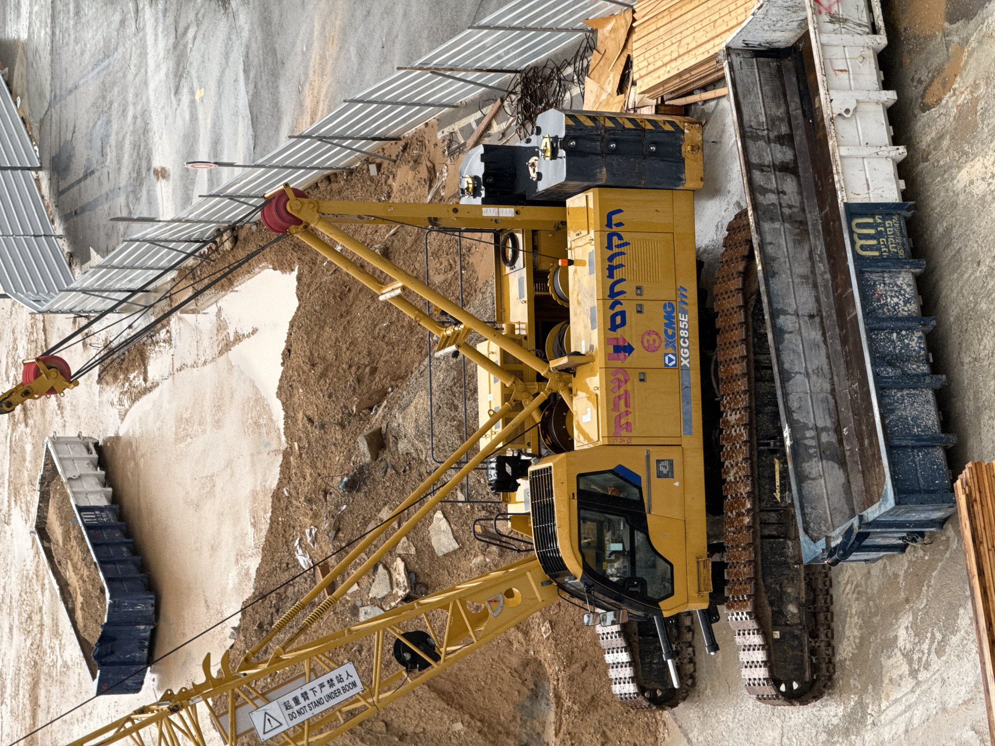 This image presents a static, overhead view of a construction site located in Tel-Aviv, Israel, characterized by wet and muddy conditions. A large, yellow XCMG XGC85E crawler crane, displaying "הקודחים" (Hakodchim) in Hebrew and a warning sign in English and Chinese ("DANGER DO NOT STAND UNDER BOOM") on its boom, dominates the central foreground. The crane features visible tracks, a cab, and counterweights at its rear. The ground is unpaved, consisting of reddish-brown earth, significant puddles of water, and disturbed soil piles. Two roll-off containers are visible: one, dark blue and white, is positioned in the upper left, filled with earth. The second container, also blue and white, is located in the lower right, partially obscured by the crane's tracks; it appears largely empty with some accumulated water and is labeled with "מ. נ. פיני פתרונות" (M.N. Pini Solutions) and a phone number in Hebrew. Along the right side of the image, a corrugated metal construction fence separates the muddy site from an adjacent, wet asphalt surface, likely a road or paved area. Stacks of raw wooden planks are arranged near the crane and the lower container. No people are visible within the scene. The environment appears overcast, consistent with the wet ground.
