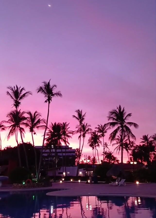 tranquil scene at a resort pool at sunset. The sky transitions from a deep pink to a vibrant purple, with a crescent moon visible in the upper portion of the sky. Silhouetted palm trees line the perimeter of the pool area, casting reflections onto the water's surface. There's a building in the background, partially obscured by the trees, with lights visible. Some outdoor furniture, including tables and chairs, are placed poolside. The lighting suggests it's either dusk or early evening.