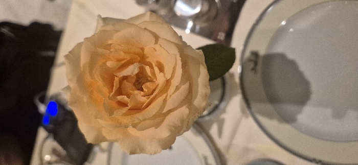 An overhead shot captures an apricot-colored rose in full bloom, positioned near a white plate with a dark shadow. To the left, a blurry black object with blue lights sits adjacent to the flower. A green leaf peeks out from behind the rose. In the background, blurred silver objects add depth to the composition, suggesting a table setting.