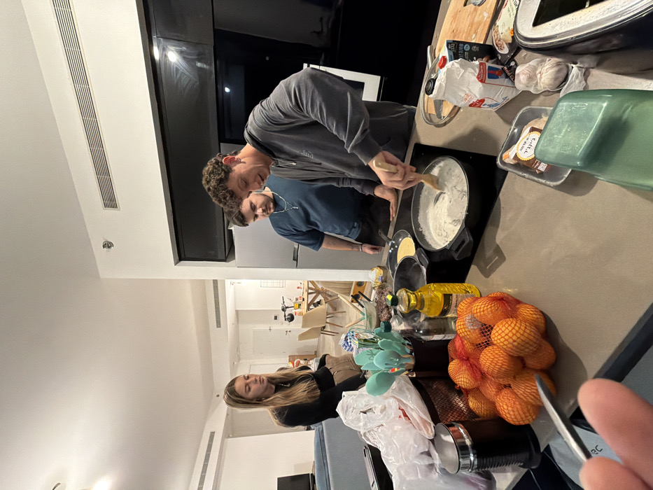 Two men are standing at a kitchen counter. One is stirring something in a pot on a hot plate. A woman sits on a couch in the background, facing away from the camera. On the counter are oranges in a mesh bag, cooking oil, groceries, and a covered dish. The room is brightly lit with modern decor. A glimpse of a dining area is visible in the background.