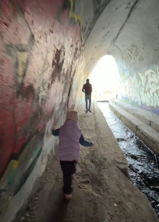 A low-angle video shows a young child and an adult walking away from the viewer inside a concrete tunnel. The child, wearing a puffy vest, dark pants, and a hat, is in the foreground and facing away from the camera. The adult, dressed in a dark jacket, is ahead of the child, moving towards the light at the end of the tunnel. A narrow stream of water flows along the right side of the walking path. The tunnel walls are covered in graffiti.