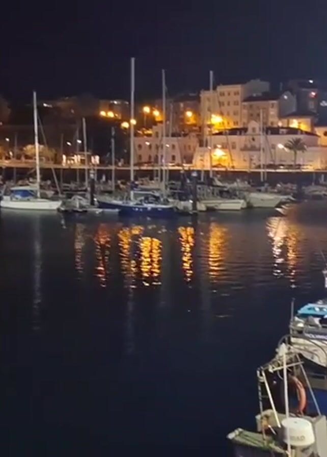 harbor at night. Various boats, including sailboats and fishing boats, are docked. Buildings lit with warm lights line the harbor's edge, and their reflections shimmer on the water. The video is taken from the dock level. The sky is dark, and the atmosphere appears calm.