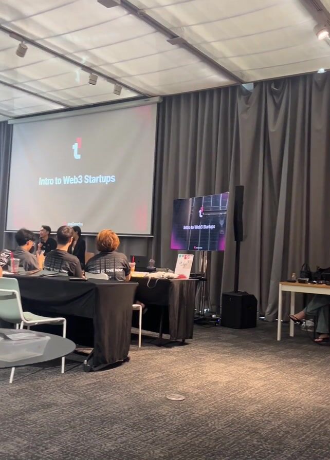 room with people sitting and watching a presentation called “Intro to Web3 Startups”