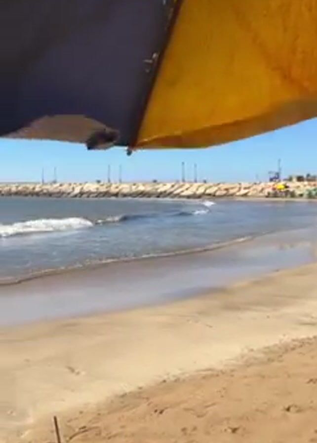 From under a partially torn beach umbrella colored yellow, blue, and red, a view of a sandy beach and an ocean pier is visible. Small waves are breaking gently on the beach. The sky is clear and blue. The umbrella is torn in several places. In the distance, people are visible on the pier. The sand is damp near the water, and footprints are visible.