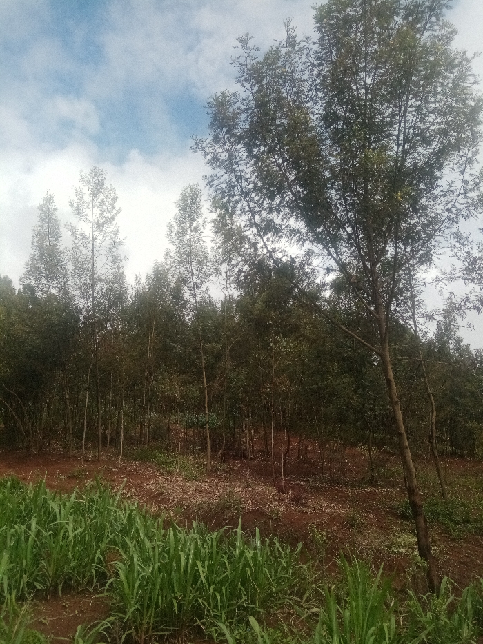 This image depicts an outdoor agricultural and forested scene in Ndeiya, Kenya, under a partially cloudy sky