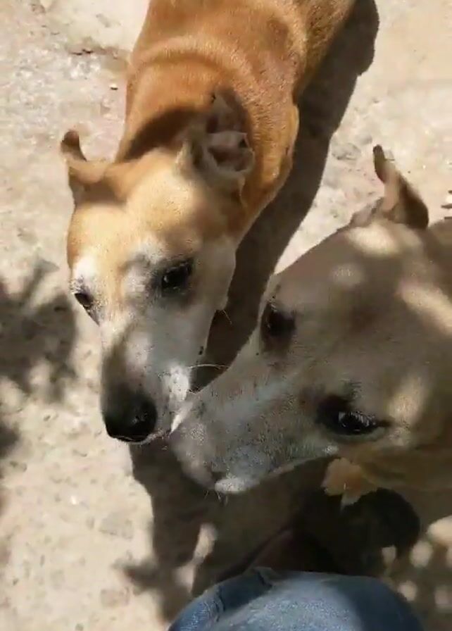 two medium-sized dogs with light brown and tan fur standing on a light grey concrete surface in bright sunlight. Shadows of trees or plants are visible. One dog nuzzles the person holding the camera, while the other dog stands behind and then turns to lick its tail. The person is wearing blue jeans.
