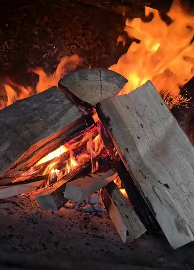 roaring fire inside a fireplace or wood stove. Several large, irregularly shaped pieces of wood are stacked in a triangular formation, with flames visible between and around them. Smaller pieces of wood are scattered underneath. The flames are bright orange and yellow, licking upwards. The interior of the fireplace appears dark and sooty, with charred material visible behind the burning wood. There is a dark metal frame around the opening. Sparks occasionally fly up from the fire. A distinct popping sound can be heard.