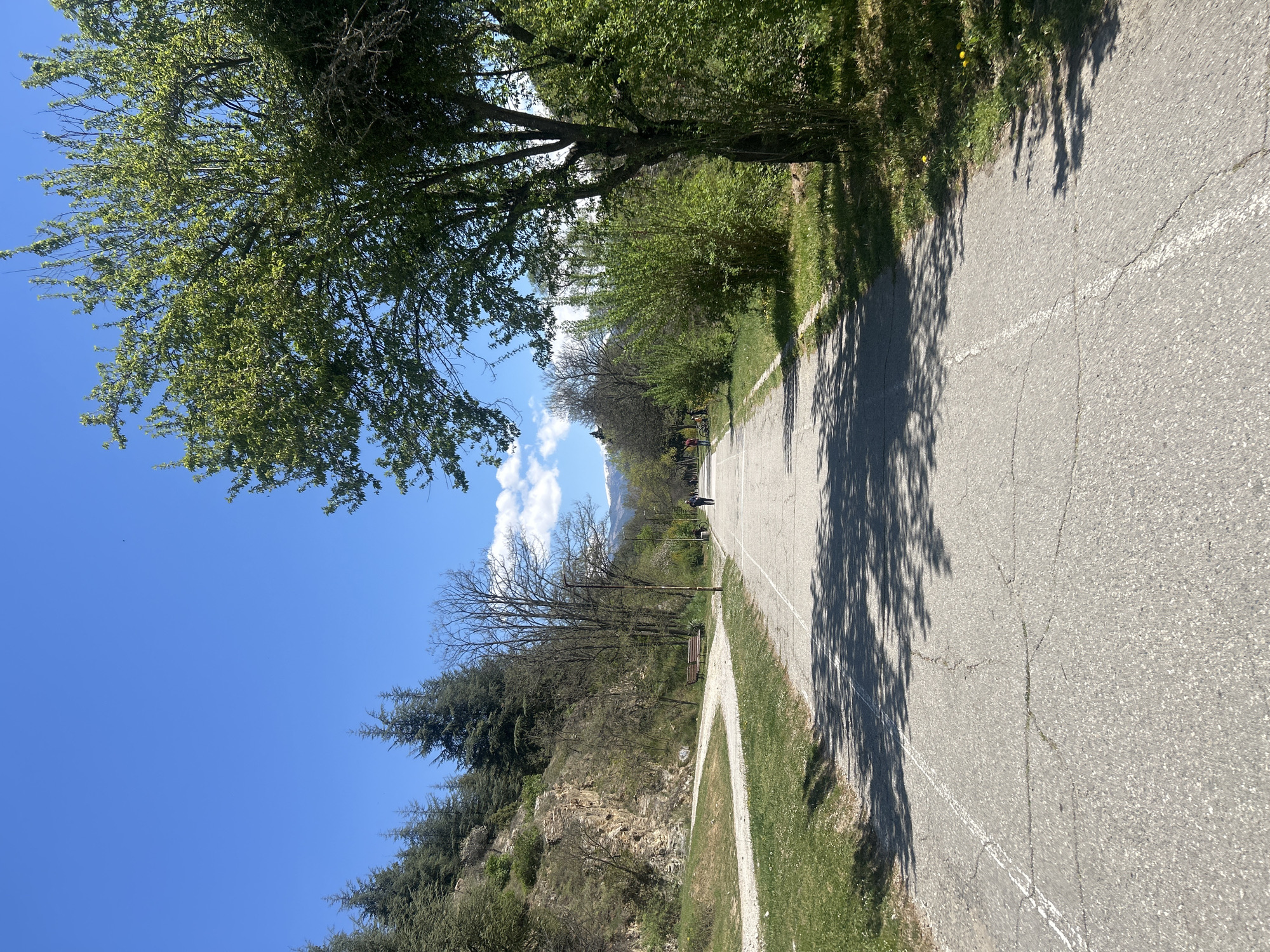 A paved road runs through a park setting with mountains visible in the distance. The road has white painted lane markings and some cracking. To the right of the road is grassy verge with tree shadows cast across the pavement. To the left of the road is a hillside with trees and greenery. A person is walking in the distance. Based on the vegetation and terrain, this location is likely in or near Blagoevgrad, Bulgaria.