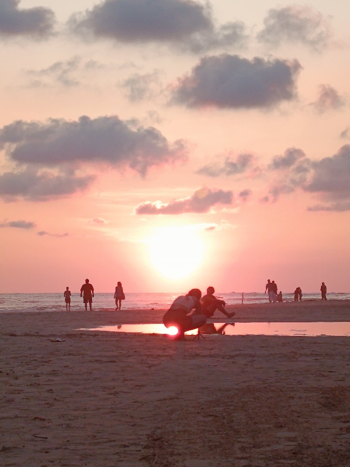 This image displays a sunset on the sandy beach of Kabalana, Sri Lanka. The sky presents a gradient of orange, pink, and light blue, punctuated by scattered dark and light clouds. The sun, a bright white and yellow orb, is centered low on the horizon, its intense light reflecting prominently on the ocean surface and an elongated puddle in the mid-foreground. A total of ten or more human figures are visible, all silhouetted against the bright sky. In the mid-foreground, one individual is in a low crouch next to the puddle, appearing to capture or interact with the sun's reflection within it. A small, dark object, consistent with a tripod, is present near their feet. Another figure is seated directly to the right of the crouched individual, both casting reflections into the puddle. Further in the background, near the water's edge, three figures stand together. An additional five or more figures are distributed along the shoreline to the right. The scene depicts a coastal environment during twilight, with individuals present on the beach.