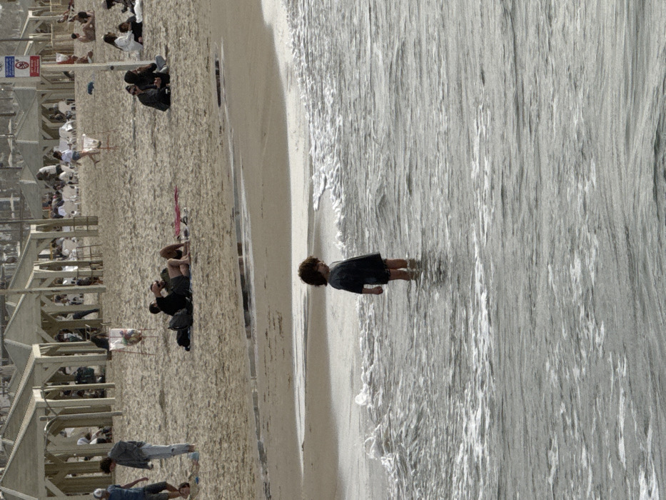 This image depicts a beach scene in Tel-Aviv, Israel, characterized by its sandy shore, numerous beachgoers, and distinctive wooden pergolas with white fabric roofs. In the foreground, a young child with dark, curly hair, dressed in a dark t-shirt and dark shorts, stands in the shallow, wavy seawater, facing left. The water level reaches approximately the child's upper thighs. The midground reveals the sandy beach occupied by several individuals and groups. To the left, an adult male in light jeans and a grey shirt stands near another partially visible person. Central to the midground, two individuals are reclined on a blue mat on the sand, adjacent to a dark backpack and a pink towel. Further right, another pair of individuals sits on the sand. A white signpost with red text and symbols, including the Olympic rings, is positioned upright, near a vendor's portable stand displaying items in a net bag. The background shows a continuation of the sandy beach, populated by additional people either standing or seated on white chairs beneath a series of light-toned wooden pergolas. The sky appears bright but overcast. The ocean surface exhibits small, white-capped waves breaking near the shore, transitioning to smoother water further from the beach.