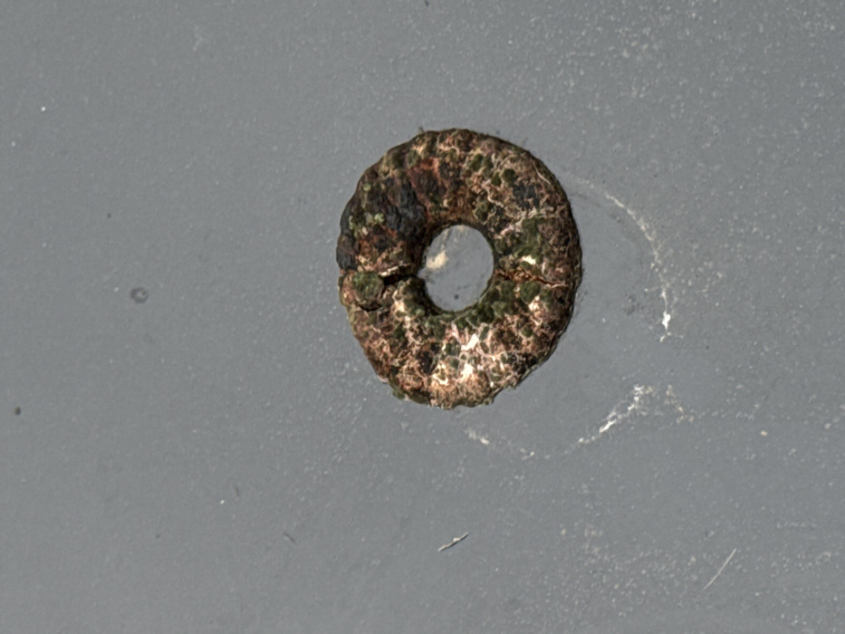 This image depicts a singular, circular, ring-shaped object centered on a flat, matte gray surface. The object, approximately 8-10 centimeters in outer diameter, features a distinct central circular aperture. Its surface is heavily textured and irregular, displaying a composite of dark brown, reddish-brown, and varying shades of green organic growth, consistent with mold or lichen. A discernible fissure or break is present on the object's upper-left quadrant. The uniform gray background surface exhibits minor particulate debris and subtle, faint circular residue marks immediately surrounding the object. No individuals, actions, or direct interactions are visible. The environment appears static under diffused lighting conditions. This scene is located in Sofia, Bulgaria.