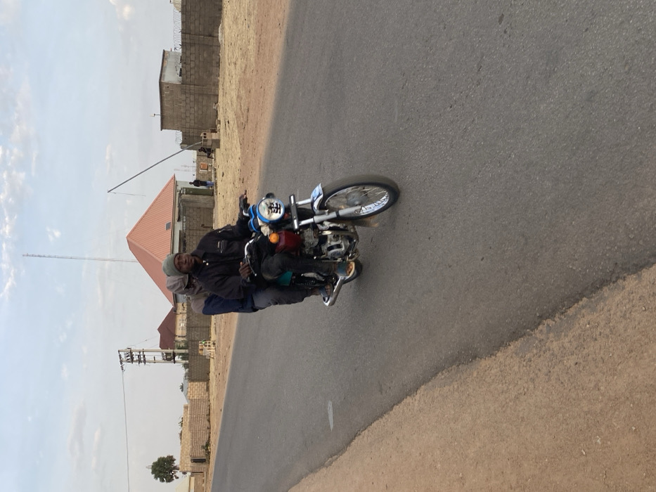 A motorcycle carrying two people travels on an asphalt road. The rider is facing forward, wearing a dark jacket and cap. The passenger sits behind, partially obscured. A mix of residential and barren landscapes lines the road. Buildings with rusty orange roofs and sandy terrain fill the background under a slightly overcast sky. A tall communication tower stands in the distance, adding to the sparse urban setting.