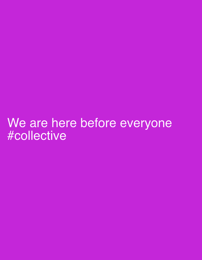 The image displays a uniform magenta field containing white sans-serif text. The text, centered within the frame, states: "We are here before everyone" on the upper line, followed by "#collective" on the lower line. The scene is described as being located in Voluyak, Bulgaria. There are no observable people, objects, actions, interactions, or environmental details other than the textual content and its colored background.
