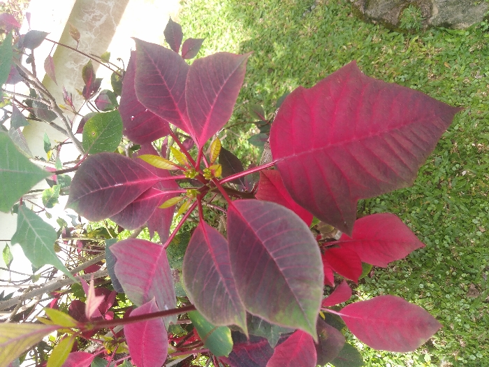 The image displays a detailed view of a Poinsettia (Euphorbia pulcherrima) plant, located in an outdoor garden setting in Cipanas, Indonesia. The plant features numerous large, ovate bracts predominantly in deep crimson and maroon, with some exhibiting green coloration, particularly on older or less mature leaves. Small clusters of yellowish-green cyathia are visible at the center of the red bract arrangements. The plant's stems are reddish-brown. The immediate ground beneath the plant is covered with short, green grass. A light-colored, likely off-white or cream-colored, solid structure, possibly a wall, is partially visible in the upper right background. The scene is illuminated by natural daylight. No individuals, animals, or objects indicative of specific actions or interactions are present within the frame.