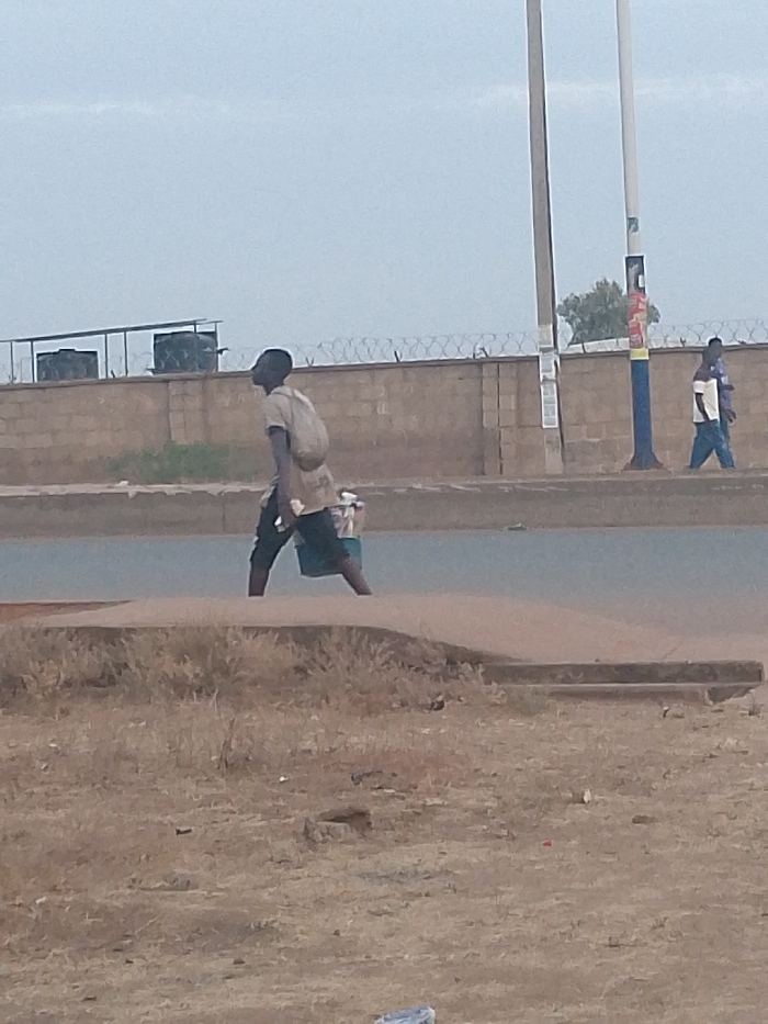A person with a sack slung over their back walks along a sidewalk beside a street, carrying a bucket filled with items. Another person in light-colored clothing walks further down the same sidewalk in the opposite direction. A low brick wall topped with barbed wire stretches along the background, and a utility pole stands near the sidewalk. The foreground shows dry, brown vegetation. The sky is overcast and light grey.