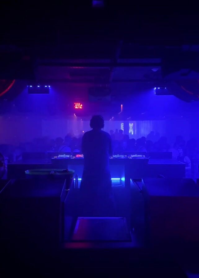 DJ playing music at a crowded nightclub. The DJ is standing behind a mixing console with headphones on, facing a crowd of people. The club is dimly lit with blue and red lighting, and there is a haze in the air. The club’s name, “FX,” is displayed on a wall behind the DJ. The music is loud and upbeat.