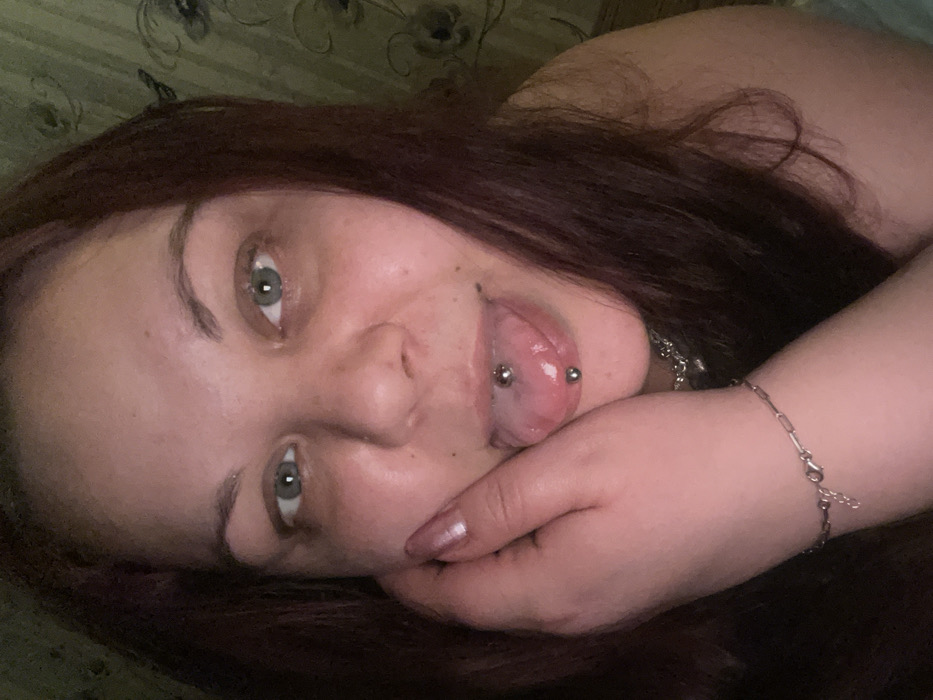 An adult female individual is depicted in a close-up photograph, presenting a front-facing view. She possesses long, dark auburn hair, green eyes, and well-defined eyebrows. Her mouth is open, with her tongue slightly extended, displaying two silver-toned barbell piercings vertically aligned along the centerline. The individual's left hand is positioned against her left cheek, with fingers extended. Her fingernails are long and coated with a light, shimmering polish. A delicate silver-toned chain bracelet with elongated links is present on her left wrist, and a segment of a chunkier silver-toned chain necklace is visible below her chin. The subject is looking directly into the camera lens with a subtle, playful expression. The background is out of focus, revealing an indoor setting with a patterned surface, likely wallpaper, featuring light green hues and darker floral or leaf motifs. The alleged location in the city of Troyan, Bulgaria, cannot be corroborated by any visual evidence within the image.