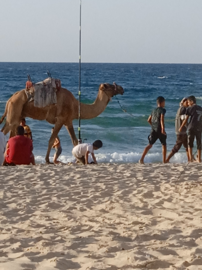 - "The image depicts a daytime beach scene in Al-Mawasi, Palestinian Territories, featuring a dromedary camel, multiple individuals, and a fishing rod at the water's edge" by FM-cV3b62, licensed under CC BY 4.0