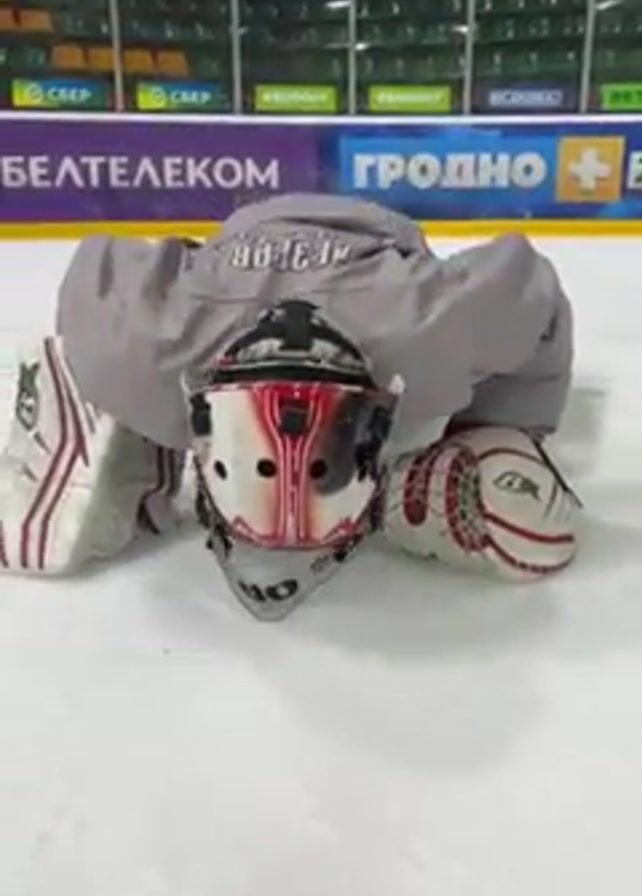 In an indoor ice hockey rink, a hockey goalie dressed in full gear is doing push-ups on the ice