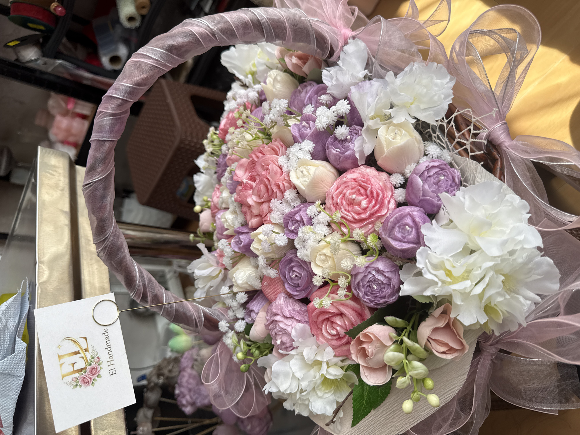 A close-up shot shows a floral arrangement in a basket. The basket has a handle wrapped with light purple ribbon. The arrangement features roses and other flowers in shades of white, pink, and purple. A card attached to the basket handle displays a logo reading "El Handmade" with floral graphics. The environment includes hints of a storage or craft area with spools of thread and other items visible in the background. The location is inferred to be in Sofia, Bulgaria, based on the brand's name, "El Handmade".