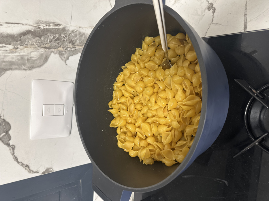 - "A dark grey cooking pot, filled with golden yellow conchiglie pasta, rests on a black glass-ceramic stovetop" by FM-xsYuv2, licensed under CC BY 4.0