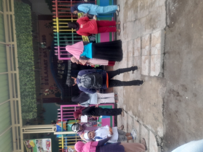 People stand outside a building with a colorful gate. The building has writing in another language on it. The people are wearing a variety of clothing, including hijabs, dresses, and casual wear. Some people are carrying bags or backpacks. There is a small child in the front wearing a helmet. The ground is paved and there are some plants growing around the building.