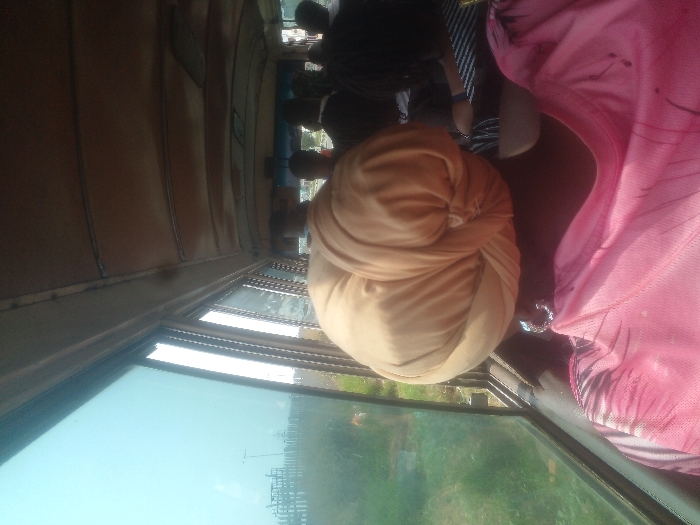 The scene depicts the interior of a public transport vehicle, likely a bus, located in Alaiyabiagba, Nigeria. The vehicle's worn, light brown ceiling is visible overhead. On the left, a large, rectangular window with a slight blue-green tint provides a view of the exterior. Outside, a patch of green grass is visible in the foreground, followed by a dark fence and a complex industrial structure featuring scaffolding or piping under a hazy, light blue sky. Inside the vehicle, several passengers are seated, primarily visible from the backs of their heads and shoulders, occupying seats further into the vehicle. In the immediate foreground, a substantial bundled object made of beige or tan fabric rests near the window. Below it, a bright pink garment with dark, irregular patterns or markings is draped across a surface, partially visible in the bottom right of the frame.