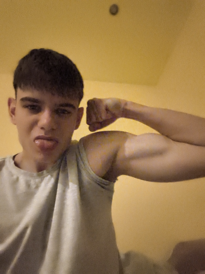 The image displays a young male positioned indoors, presenting a flexed bicep