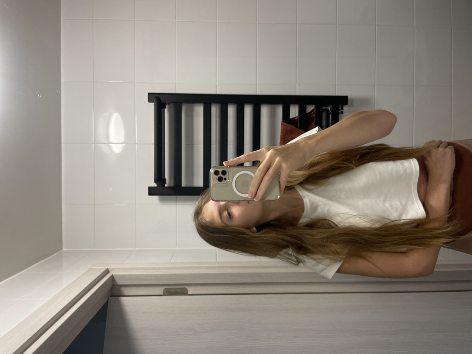 The image displays a mirror selfie taken by an individual in a bathroom located in Unknown, Unknown