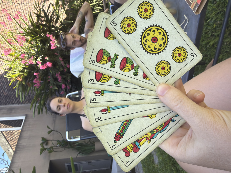 An outdoor scene in a residential area of Vicente López, Argentina, is captured under bright daylight. In the immediate foreground, a light-skinned hand, appearing to be female, holds a fan of six well-worn Spanish playing cards: the 1 of Clubs, 6 of Swords, 5 of Swords, 3 of Cups, 6 of Cups, and 5 of Coins (showing five yellow sun-like motifs). In the midground, two individuals are seated in lounge chairs, looking towards the camera. To the left, a female with dark hair, wearing a black halter-neck top, sits upright in a dark grey mesh chair, maintaining a neutral expression. To her right, a male with a light beard and sunglasses resting on his head is bare-chested, displaying a tattoo on his left shoulder/arm. He is leaning back in a lighter-colored lounge chair draped with a light blue and white striped towel, with his right hand positioned behind his head. The ground is covered with green grass. In the background, a light brown brick building with a white-framed window and a terracotta roofline is visible. Lush green foliage and a large bush with vibrant pink flowers are situated behind the seated individuals. A dark outdoor table with a small cardboard box rests on the right side of the frame.
