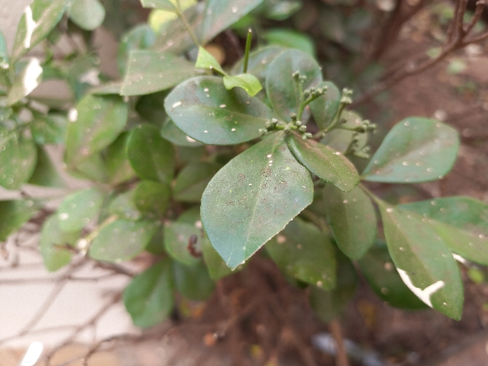 The image displays a close-up view of a green leafy plant, observed in Oturkpo, Nigeria. The foreground is dominated by multiple dark green, ovate leaves, many of which are covered with fine particulate matter consistent with dust or dirt, and marked by scattered, small, irregular white spots. A distinct, larger, irregular white streak is present on a leaf in the lower-left portion of the frame. Towards the center-right, clusters of small, green, spherical flower buds are visible. A small, dark-bodied insect, consistent with an ant, is positioned on a leaf in the upper-central area, appearing to be in motion. The background is blurred, revealing lighter brown and beige tones indicative of soil or dried vegetation, along with out-of-focus slender branches. Natural light illuminates the foliage.