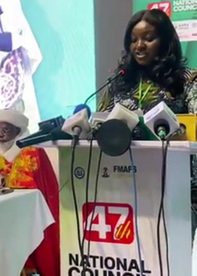 A woman is speaking at a podium, addressing an audience. The podium is decorated with the event's title, "47th National Council on Agriculture & Food Security," and the logo of the Federal Ministry of Agriculture and Rural Development (FMAFS). There are several microphones positioned in front of her. To the left of the podium is a man wearing a traditional Nigerian outfit. The background features a green and white banner. The woman is wearing a patterned dress. She is looking down at her notes as she speaks.
