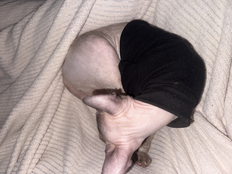 - "A hairless Sphynx cat curls up on a textured blanket" by FM-VS3GA3, licensed under CC BY 4.0