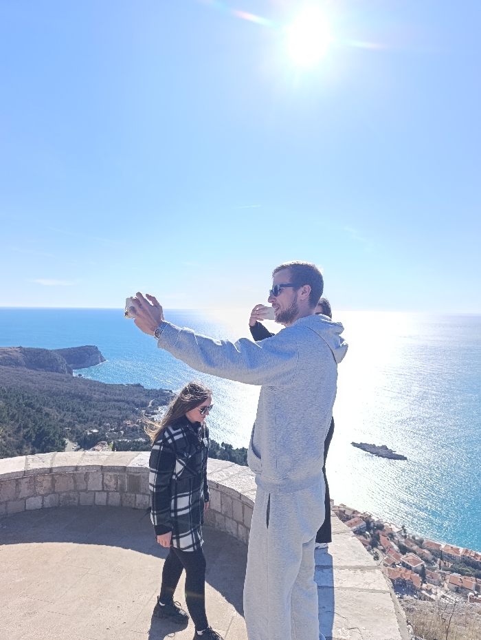 A group of people stands on a stone platform overlooking a scenic coastal view. A man in a gray hoodie and sweatpants holds up a phone, seemingly taking a picture. To his left, a woman in a black and white plaid jacket and black leggings looks out at the landscape. The sea is visible in the background, sparkling in the sunlight, with a rocky coastline and a small island adding to the panorama. The sun shines brightly in the sky.