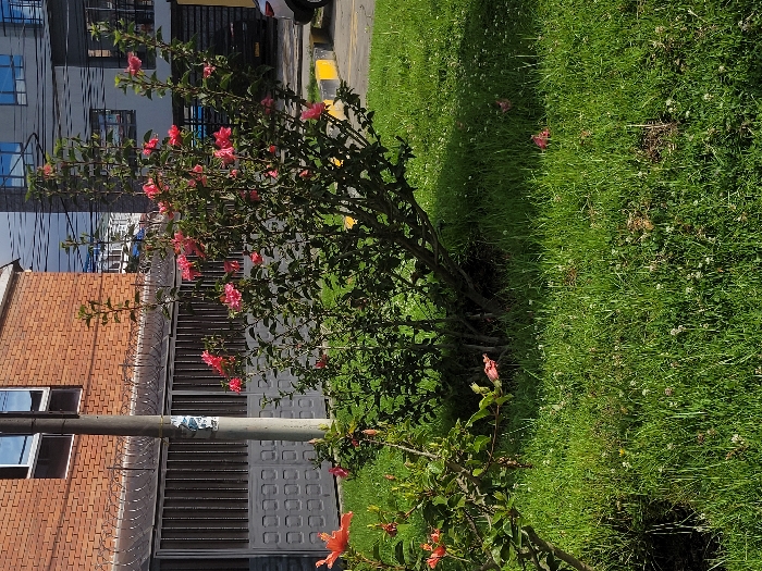 A blooming hibiscus bush sits adjacent to a vibrant green lawn