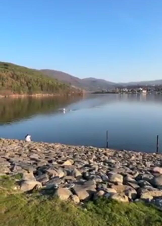 still lake on a sunny day. Mountains covered in trees are visible in the background, and a town is visible on the far shore. In the foreground is a rocky bank with some grass. A person is sitting on the rocks near the water's edge. In the middle of the lake, a rower is propelling a single scull towards the viewer.
