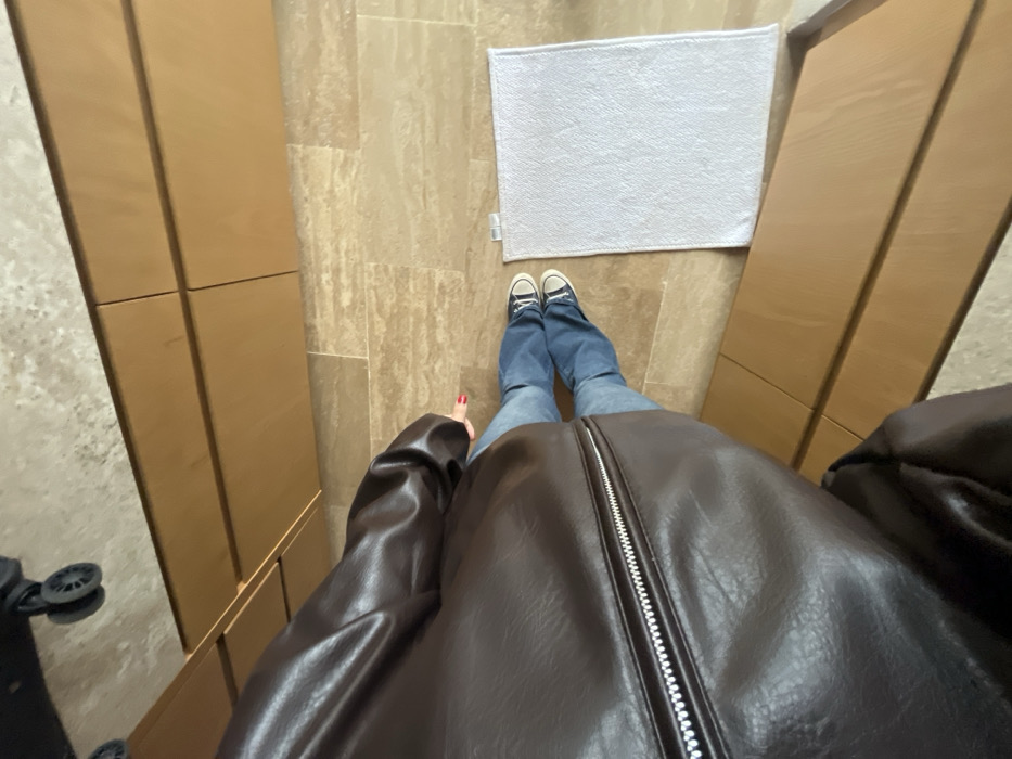 A top-down shot reveals a person standing on a beige tile floor with a white bath mat nearby. They wear blue jeans and black Converse sneakers. A brown leather jacket dominates the foreground, its silver zipper running vertically. To the left and right are light brown wooden cabinets. The red painted toenails adds a small detail to the scene.