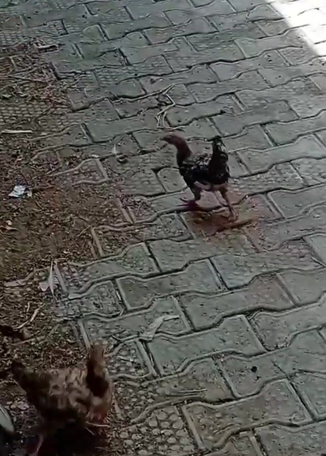 two chickens walking on a paved walkway