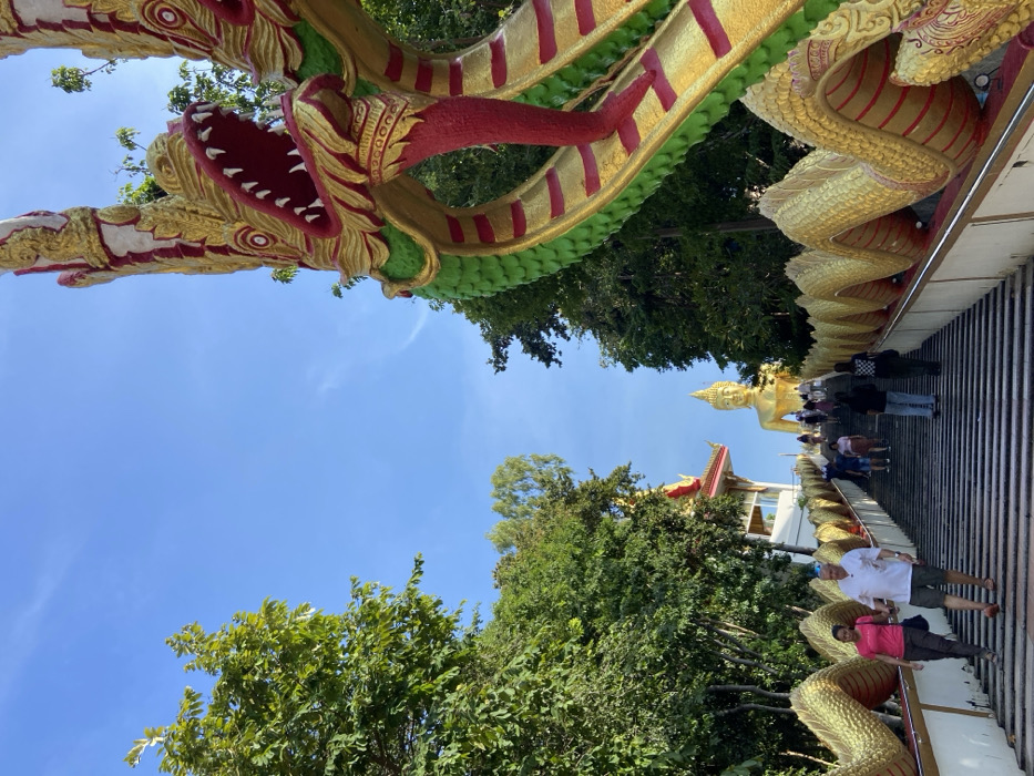 The image displays an upward-angled view of the concrete staircase leading to Wat Phra Yai (Big Buddha Temple) on Pratumnak Hill in Pattaya City, Thailand. The central element is a wide staircase, approximately 20-30 steps visible, flanked by ornate, multi-headed Naga (mythical serpent) balustrades painted in gold, green, and red. The head of a Naga, featuring an open mouth with visible fangs and a red interior, is prominent in the upper right quadrant, curving upwards. At the top of the staircase, a large, golden seated Buddha statue is prominently visible. To the left of the staircase, a multi-tiered traditional Thai temple roof, gold and red, is partially visible, surrounded by dense green foliage. Lush green trees line both sides of the ascending path, framing the scene against a clear, bright blue sky with minimal cloud cover. Several individuals are present on the staircase. In the lower left, a woman in a pink top and dark pants, and a man in a white polo shirt and light shorts, are walking down the stairs. Further up the staircase, approximately 10-15 individuals are seen ascending towards the Buddha statue, wearing casual clothing. The lighting suggests a bright, sunny day.
