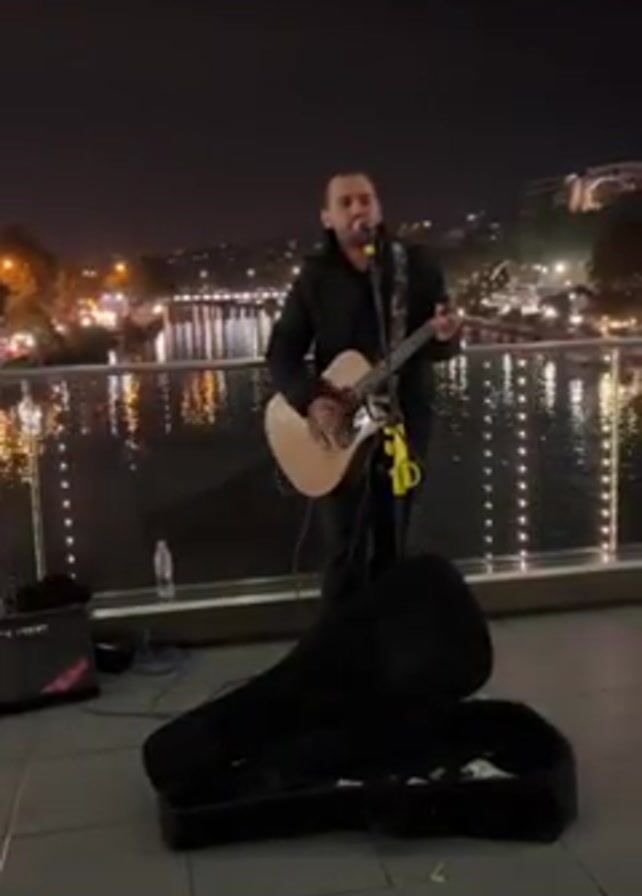 A man is playing and singing on an acoustic guitar on a tiled platform at night. He wears dark clothes and faces the camera. Behind him, a river with lights reflecting in the water stretches across the background, with buildings visible in the distance. A guitar case lies open on the ground in front of him, along with a black amplifier. A water bottle sits on the ledge behind him. The lighting is a mix of artificial lights from the platform and the background cityscape.