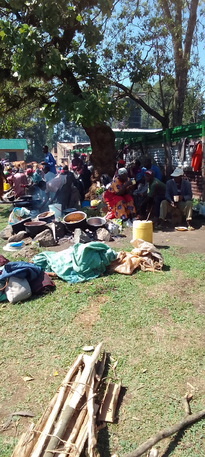 group of people gathered under a large tree in Kakunga, Kenya (latitude: 0.374, longitude: 34.855). There are several cooking pots on a fire, and the people are interacting and eating. Some people are sitting on the ground and some are standing. There are also some items of clothing and a pile of wood on the ground. The setting is an outdoor area with green grass and a large tree providing shade. There is a building in the background. A few people are cooking over the fire. Some are eating or drinking. One person is dressed in a bright orange outfit. The image shows a gathering of people in a rural setting. The environment is characterized by natural elements. The people are interacting in a casual and friendly manner.