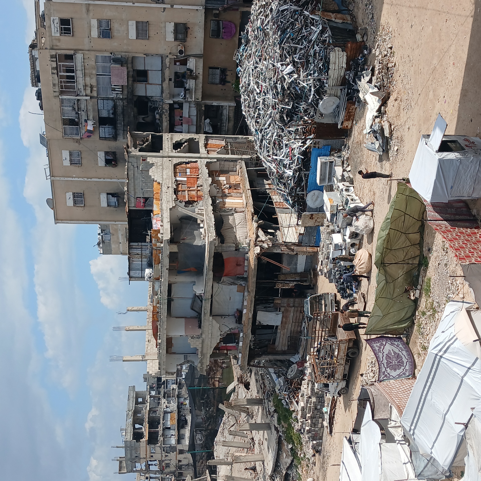 The image depicts a scene in the city of Gaza, Palestinian Territory, showing extensive destruction. Multi-story buildings are severely damaged, with exposed interiors and crumbling facades. Debris and rubble are widespread. Adjacent to the damaged buildings, there is a large pile of scrap metal and discarded appliances. Several tents are set up, suggesting a makeshift camp for displaced people. People are visible, some appear to be going about daily activities. A small truck sits nearby the tents. The sky is visible, with some clouds.