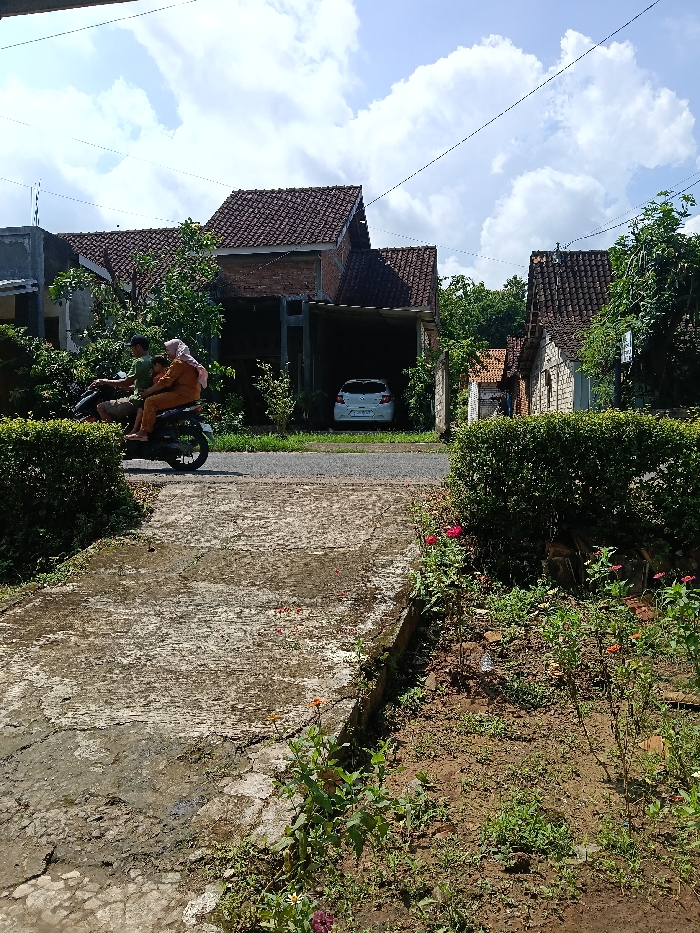 A weathered concrete driveway leads to a street where a motorcycle with three passengers travels past houses with tiled roofs. One house has exposed brick and an open carport sheltering a white car. Lush green bushes flank the driveway, with a garden bed of soil and plants visible on the right. A clear sky with scattered clouds is overhead.