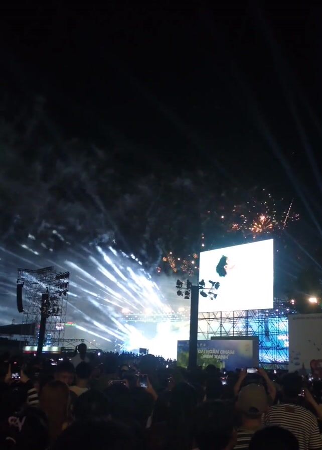 The video captures a nighttime concert or festival scene. A large crowd is gathered facing a stage illuminated by bright white spotlights. Fireworks explode in the sky, visible above the stage and crowd. Two large screens flank the center stage, displaying what appears to be a performer. Many in the audience are holding up their phones, presumably recording the event. Banners and signage with logos are visible on the stage. The sky is dark, with smoke from the fireworks drifting. The scene suggests a celebratory atmosphere at a large outdoor event.