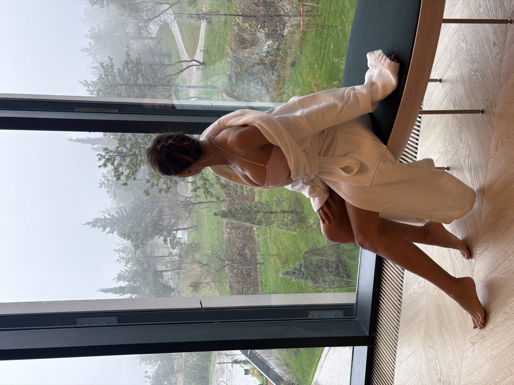A woman in a pink bra and white robe sits on a bench inside a building, looking out a window. The window overlooks a park or garden landscape with trees and grass. The building is located in Tbilisi, Georgia. The floor is made of wood. The weather outside appears to be foggy or rainy.
